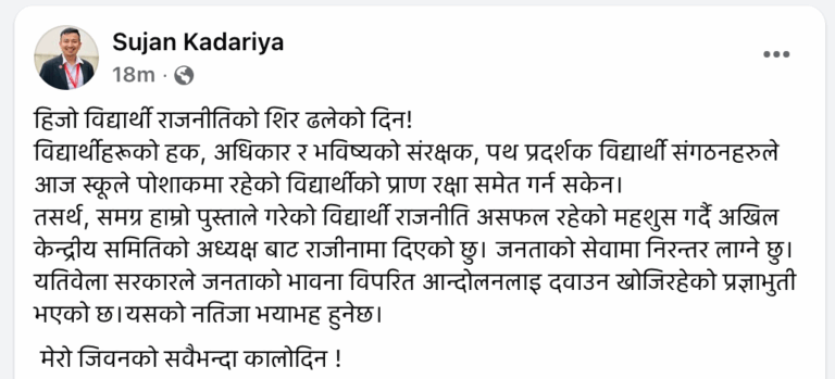 केही बेरअघि फेसबुकमा स्टाटस लेख्दै उनले राजीनामा घोषणा गरेका हुन् ।