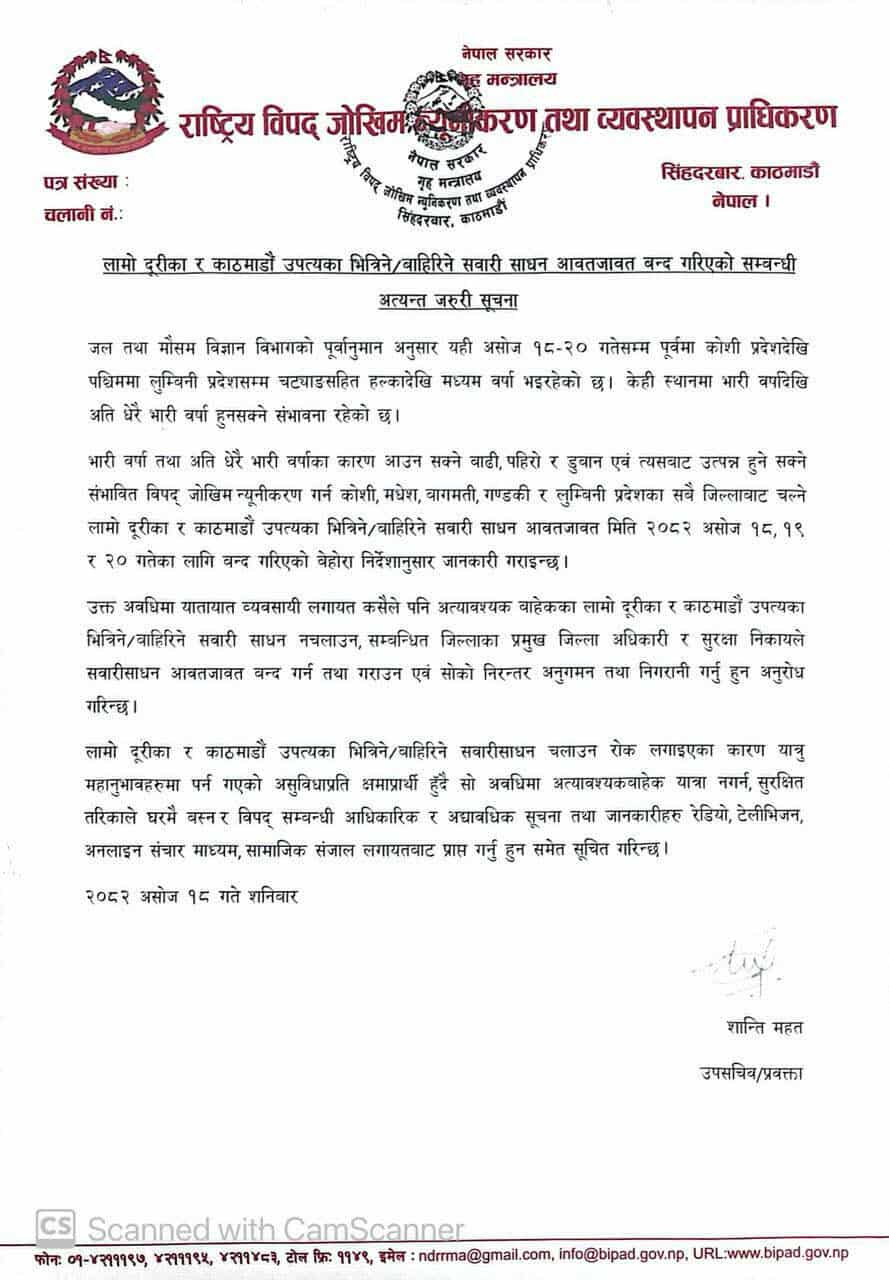 राष्ट्रिय विपद् जोखिम न्यूनीकरण तथा व्यवस्थापन प्राधिकरणले भारी वर्षाका कारण बाढी, पहिरो र डुबानको जोखिम बढेकाले उपत्यका भित्रिने र बाहिरिने सवारी साधन बन्द गरिएको जनाएको छ ।