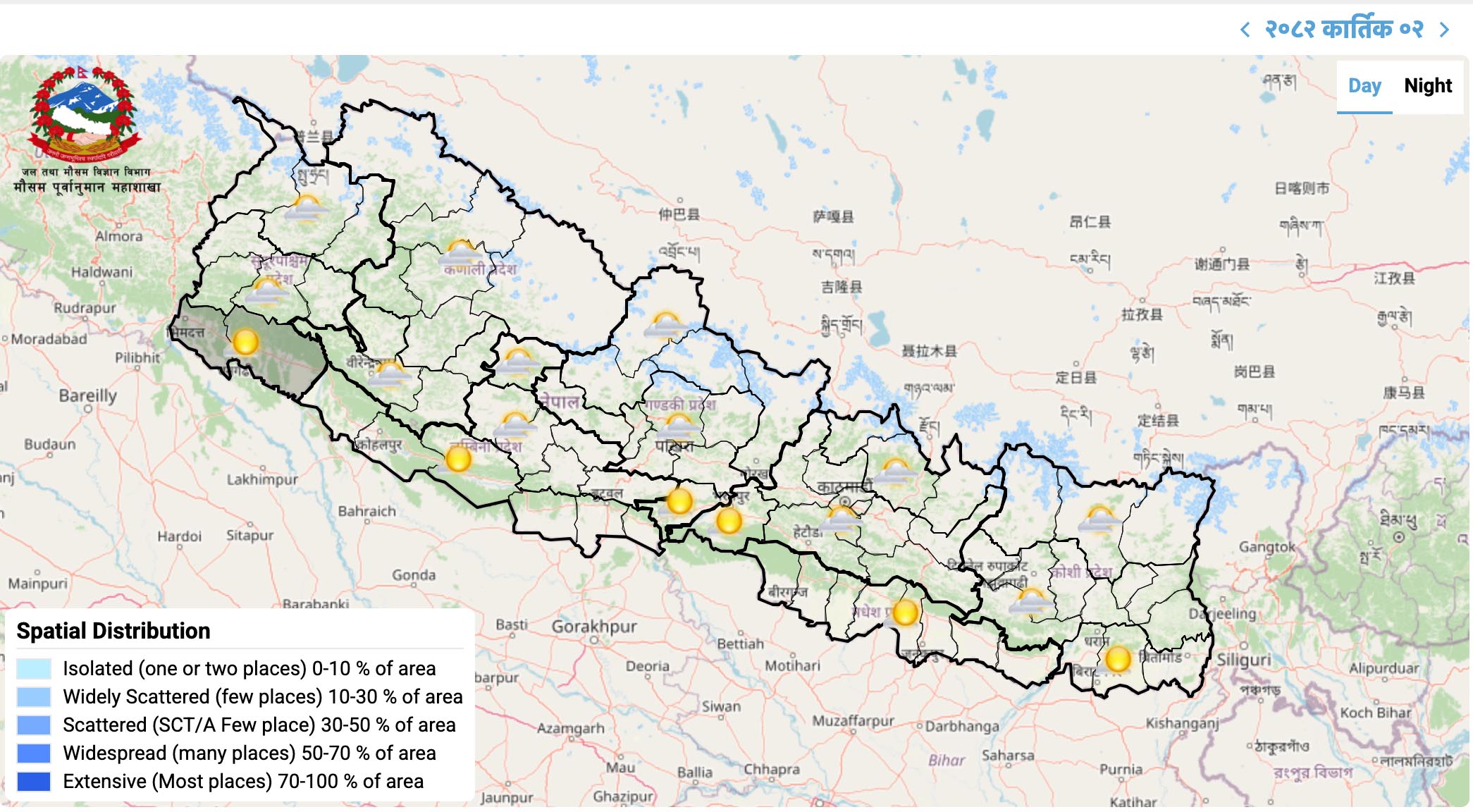 कात्तिक ५ गते पहाडी क्षेत्रमा आंशिकदेखि साधारण बदली रहने र कोशी तथा कर्णाली प्रदेशका उच्च पहाडी तथा हिमाली भूभागका केही स्थानमा हल्का वर्षा र हिमपातको सम्भावना रहेको महाशाखाले जनाएको छ ।