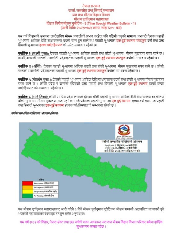 महाशाखाले तिहारको अवधिमा ठूलो वर्षा वा अप्रत्याशित मौसमी प्रभावको सम्भावना नभएकाले सामान्य तयारीका साथ पर्व मनाउन सकिने जनाएको छ ।