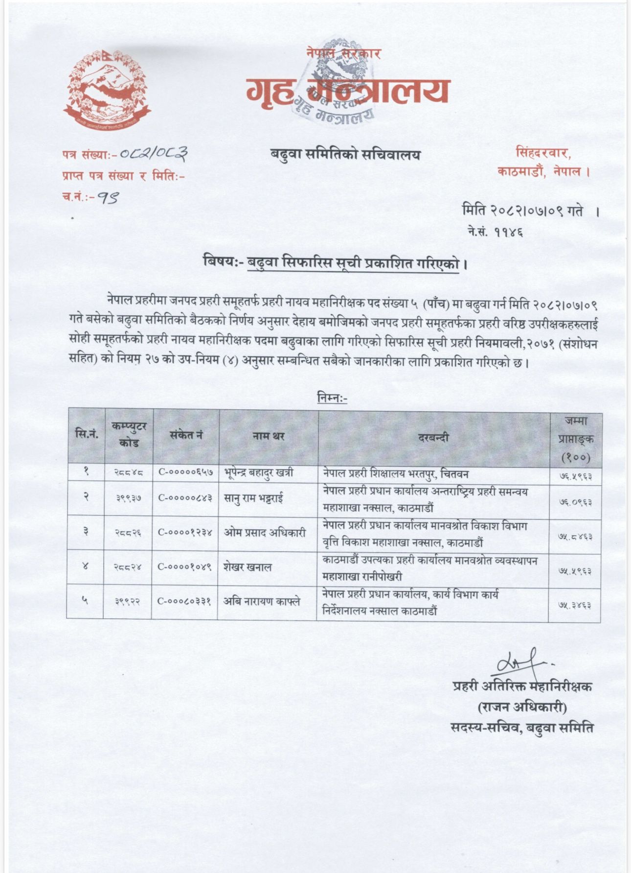 सूचनामा भनिएको छ,ʻनेपाल प्रहरीमा जनपद प्रहरी समूहतर्फ प्रहरी नायव महानिरीक्षक पद संख्या ५ (पाँच)मा बढुवा गर्न मिति २०८२।०७।०९ गते बसेको बढुवा समितिको बैठकको निर्णय अनुसार देहाय बमोजिमको जनपद प्रहरी समूहतर्फका प्रहरी वरिष्ठ उपरीक्षकहरूलाई सोही समूहतर्फको प्रहरी नायव महानिरीक्षक पदमा बढुवाका लागि गरिएको सिफारिस सूची प्रहरी नियमावली, २०७१ (संशोधनसहित)को नियम २७ को उप–नियम (४) अनुसार सम्बन्धित सबैको जानकारीका लागि प्रकाशित गरिएको छ।ʼ