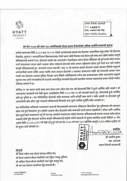 होटलका महाप्रबन्धक आशीष कुमारले मानव संसाधन विभागलाई पत्र लेख्दै होटलका सबै १३३ मजदुरलाई मंसिर २२ गतेदेखि लागू हुने गरी श्रम ऐन, २०७४ को दफा १४५ अनुसार बिदा दिने निर्णय गरिएको बताएका छन् ।