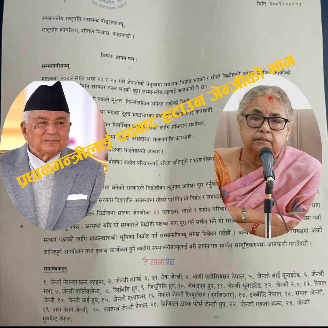 बिहीबार जेनजी २३ समूहले राष्ट्रपति रामचन्द्र पौडेललाई संयुक्त ज्ञापनपत्र बुझाउँदै वर्तमान सरकारलाई फिर्ता बोलाई नयाँ सरकार गठनका लागि मध्यस्थता गर्न आग्रह गरेका हुन् ।