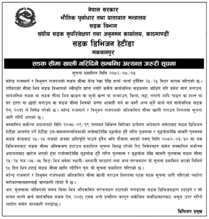 सडक डिभिजन कार्यालय हेटौंडाले आज शुक्रबार सार्वजनिक सूचना जारी गर्दै १५ दिनभित्र रातोमाटेदेखि बुद्धचोक हुँदै राप्ती पुलसम्म र बुद्धचोकदेखि सामरी पुलसम्मको सडक सीमा २५/२५ गज (७५/७५ फिट) भित्र बनेका स्थायी र अस्थायी घरटहरा तथा अन्य संरचनाहरु हटाउन भनेको हो ।