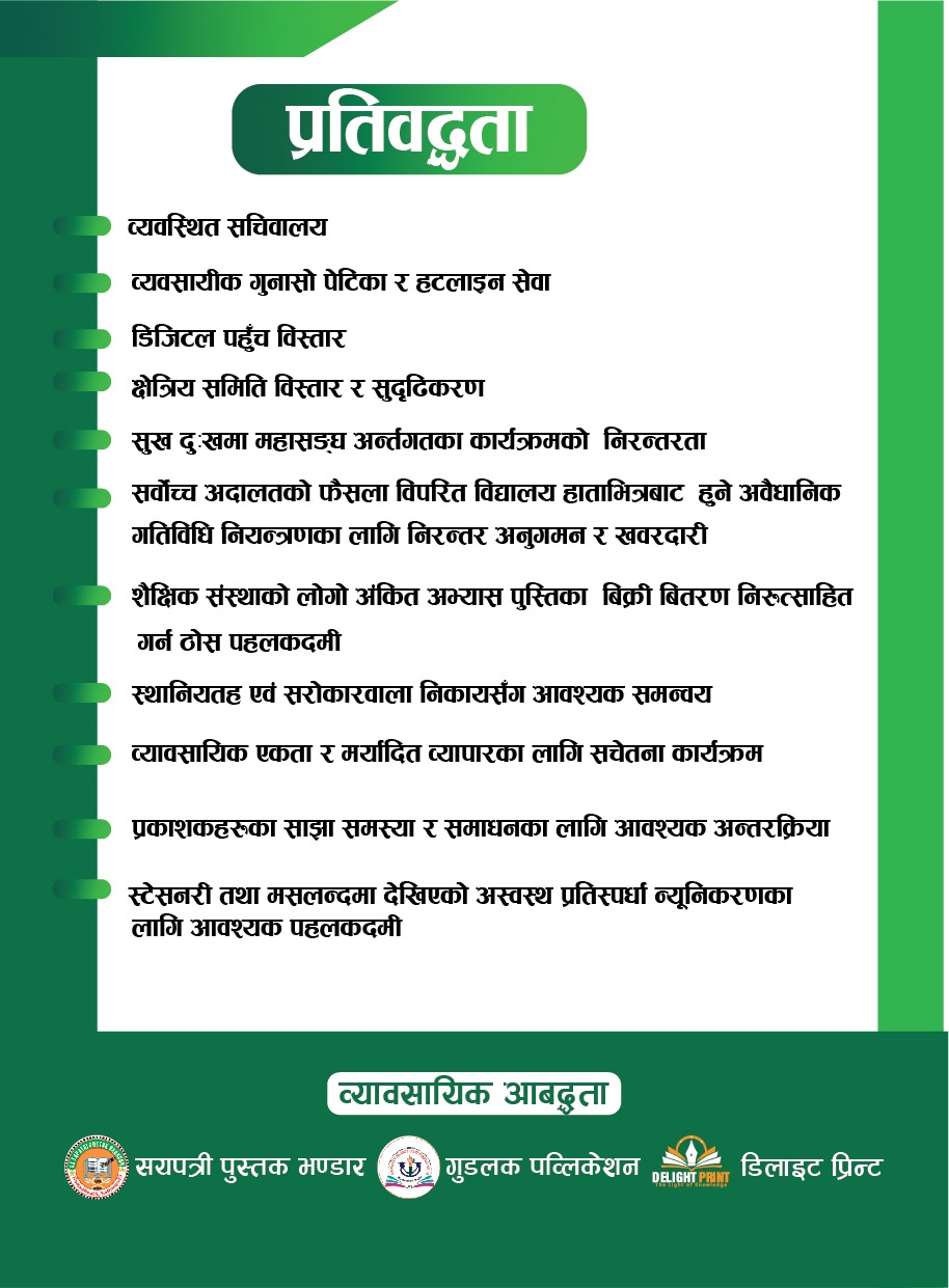 विशुद्ध व्यवसायिक संगठन भएकाले अन्य फोरमहरुमा जस्तो अस्वस्थ प्रतिस्पर्धा पुस्तक व्यवसायीहरुमा नहुने उनको भनाई छ । गुणस्तरीय उत्पादन–मर्यादित ब्यापार, नीति निर्माणमा पहुँच–सांगठनिक आधार भन्ने मूल नारासहित स्थापित नेपाल पुस्तक तथा स्टेसनरी व्यवसायी महासंघले निरन्तर लक्ष्य अनुसार काम गर्दै आएको छ ।