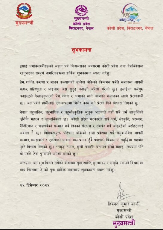क्रिसमसको अवसरमा मुख्यमन्त्री कार्कीद्वारा शुभकामना