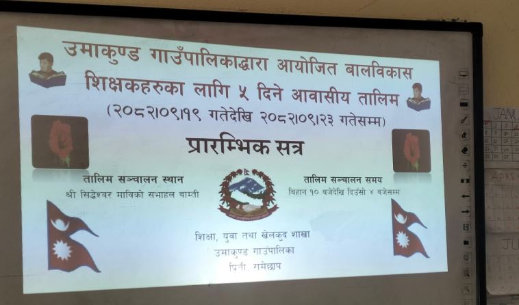 रामेछापको उमाकुण्ड गाउँपालिकामा सामुदायिक विद्यालयमा कार्यरत बाल विकास शिक्षकहरूको पेशागत क्षमता अभिवृद्धि गर्ने उद्देश्यले पाँचदिने आवासीय तालिम सिद्धेश्वर माध्यमिक विद्यालयको सभाहल बाम्तीमा सुरु भएको छ । तालिम पुस १९ गतेदेखि २३ गतेसम्म सञ्चालन हुनेछ ।