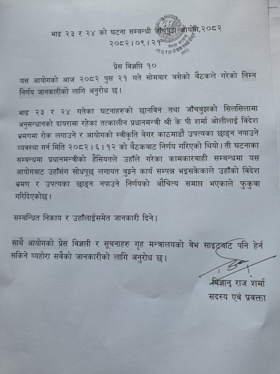 भदौ २३-२४ को घटनासम्बन्धी जाँचबुझ आयोगले तत्कालीन प्रधानमन्त्री एवं एमाले अध्यक्ष केपी शर्मा ओलीमाथि लगाइएको विदेश भ्रमण रोक र स्थान हद फुकुवा गरेको छ ।