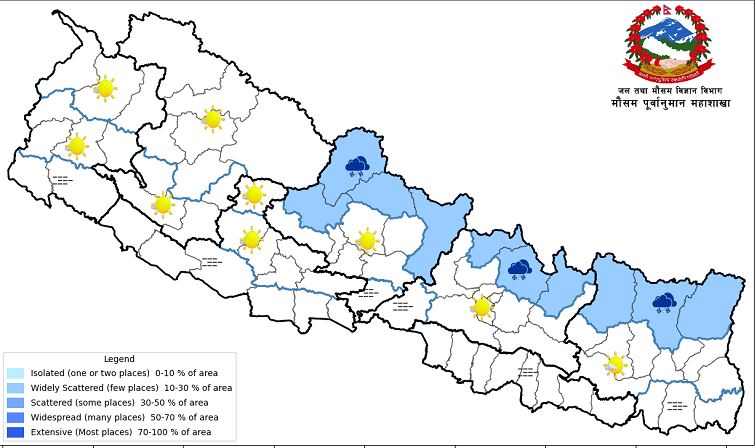 अस्ति मङ्गलबार साँझदेखि सक्रिय भएर देशका धेरै ठाउँमा वर्षा गराएको पश्चिमी न्यूनचापीय प्रणाली बाहिरिएको छ । आज उच्च पहाडी तथा हिमाली भेगका केही ठाउँमा सामान्य वर्षा र हिमपात भए पनि धेरै ठाउँको मौसम खुल्ने मौसम पूर्वानुमान महाशाखाले जनाएको छ ।
