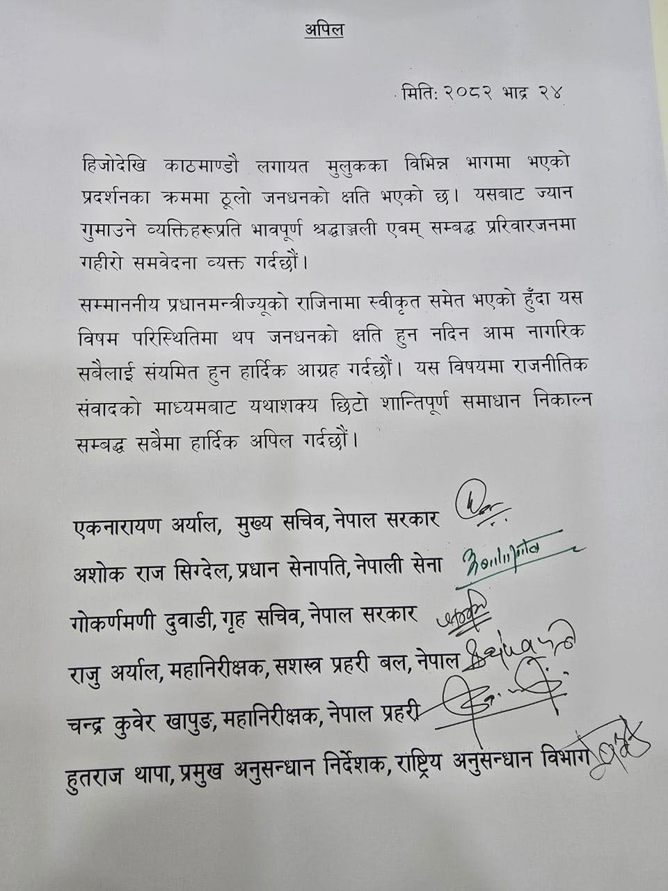 मुख्यसचिव एकनारायण अर्याल र प्रधान सेनापति अशोकराज सिग्देलसहित सुरक्षा प्रमुखहरुले प्रधानमन्त्रीको राजीनामा आइसकेको अवस्थामा संयमित भएर संवादबाट निकास खोज्न सम्बद्ध पक्षलाई अपिल गरेका छन् ।